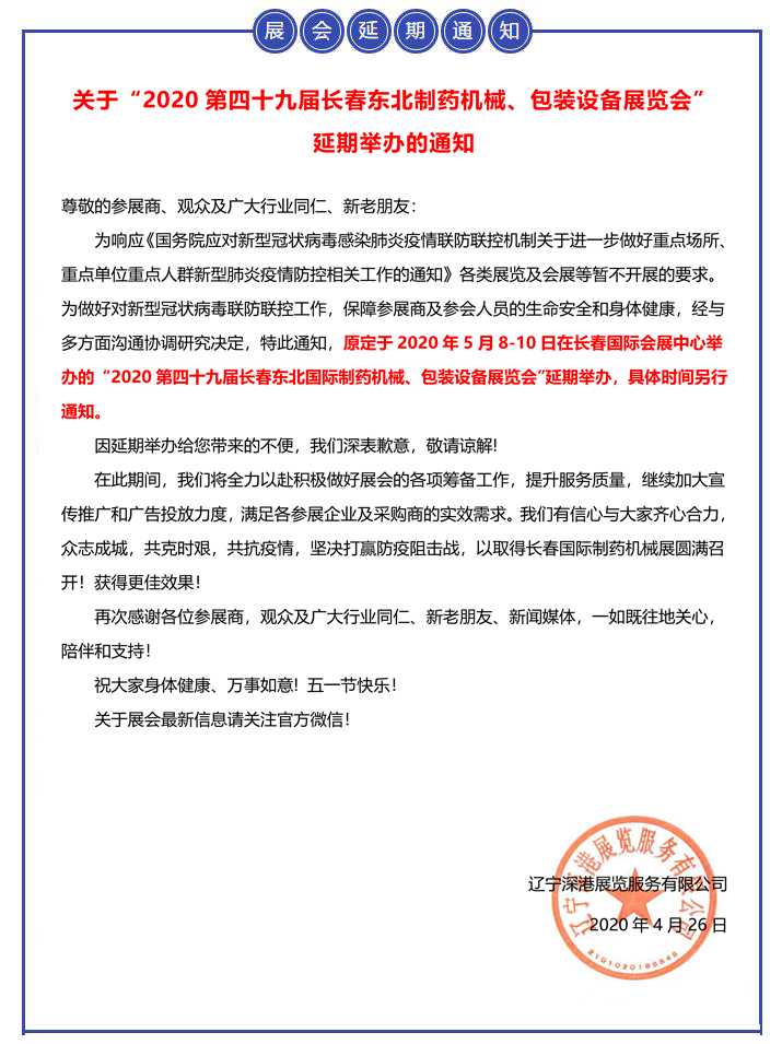 | 【重要通知】關(guān)于“2020第四十九屆長(zhǎng)春東北制藥機(jī)械、包裝設(shè)備展覽會(huì)”延期舉辦的通知 | |