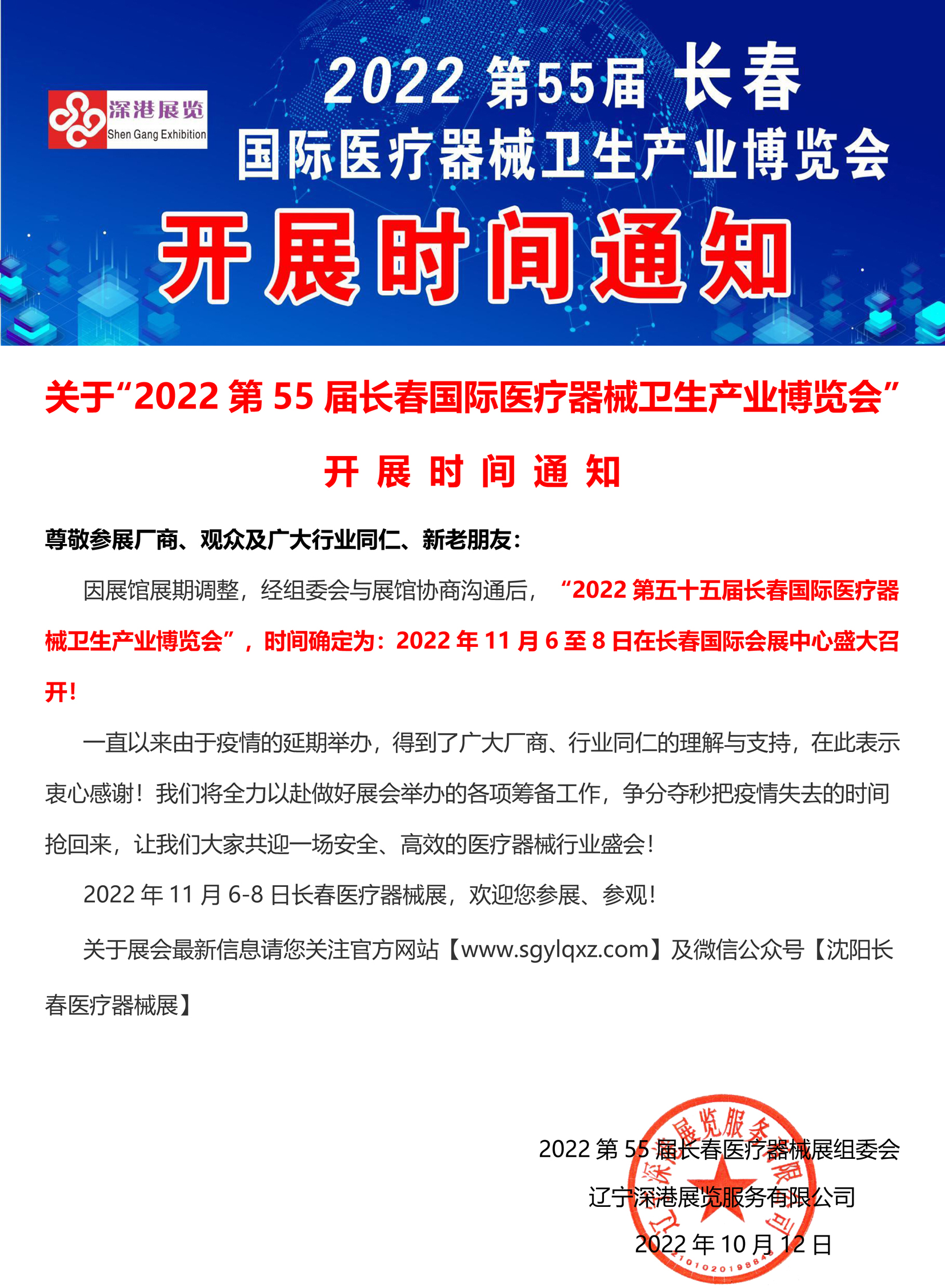 關(guān)于“2022第55屆長春國際醫(yī)療器械衛(wèi)生產(chǎn)業(yè)博覽會” 開 展 時 間 通 知 尊敬參展廠商、觀眾及廣大行業(yè)同仁、新老朋友: 因展館展期調(diào)整,經(jīng)組委會與展館協(xié)商溝通后,“2022第五十五屆長春國際醫(yī)療器械衛(wèi)生產(chǎn)業(yè)博覽會”,時間確定為:2022年11月6至8日在長春國際會展中心盛大召開! 一直以來由于疫情的延期舉辦,得到了廣大廠商、行業(yè)同仁的理解與支持,在此表示衷心感謝!我們將全力以赴做好展會舉辦的各項籌備工作,爭分奪秒把疫情失去的時間搶回來,讓我們大家共迎一場安全、高效的醫(yī)療器械行業(yè)盛會! 2022年11月6-8日長春醫(yī)療器械展,歡迎您參展、參觀! 關(guān)于展會最新信息請您關(guān)注官方網(wǎng)站【www.sgylqxz.com】及微信公眾號【沈陽長春醫(yī)療器械展】