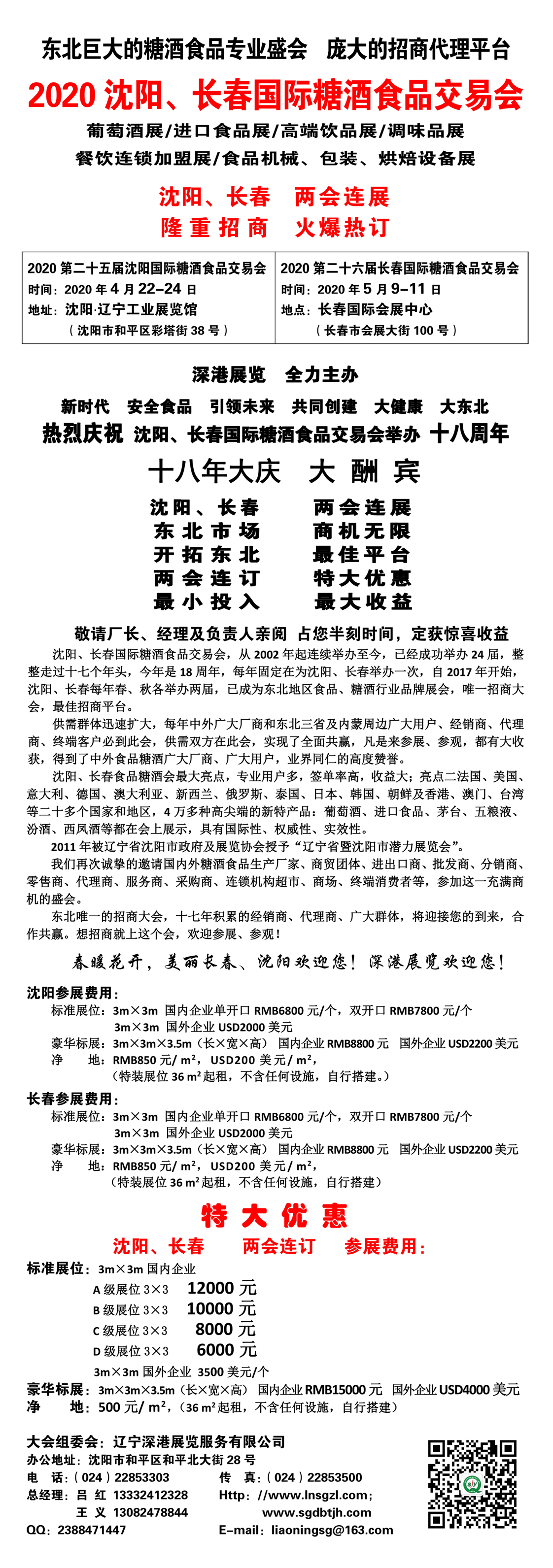 | 2020沈陽、長春食品糖酒會兩會連展 展位有限 特大優(yōu)惠! | |
