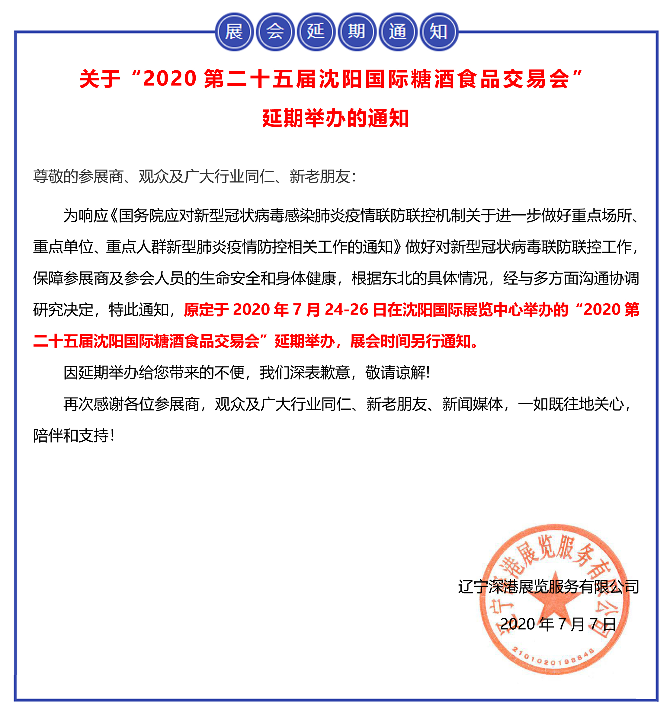 | 【重要通知】關(guān)于“2020第二十五屆沈陽國際糖酒食品交易會” 延期舉辦的通知 | |
