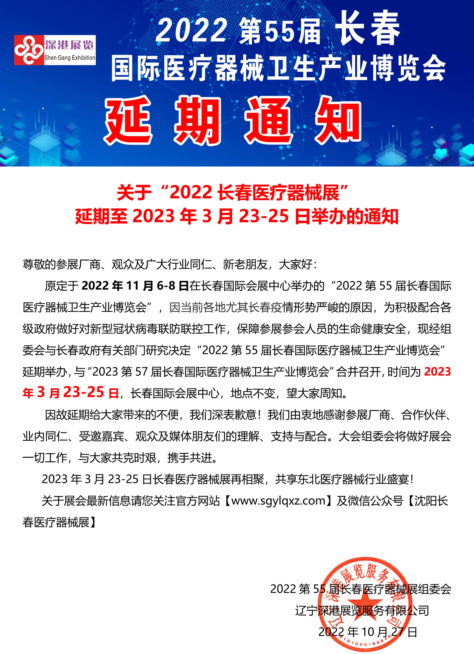 | 關(guān)于“2022長春醫(yī)療器械展”延期至2023年3月23-25日舉辦的通知 | |