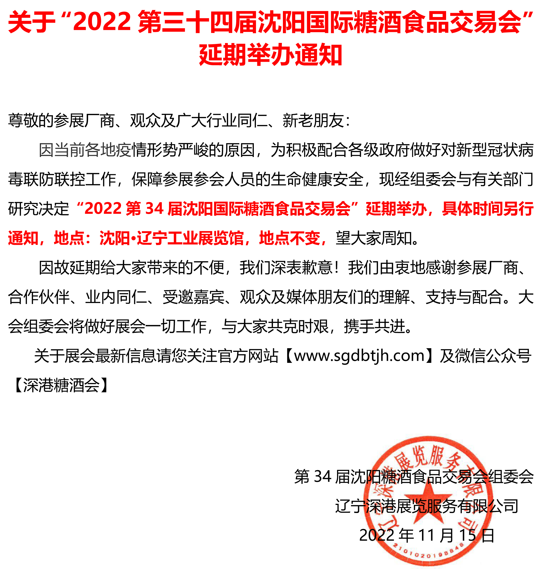 關(guān)于“2022第三十四屆沈陽(yáng)國(guó)際糖酒食品交易會(huì)” 延期舉辦通知